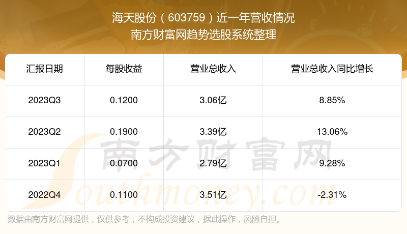 海天股份股票近一年营收情况如下表: