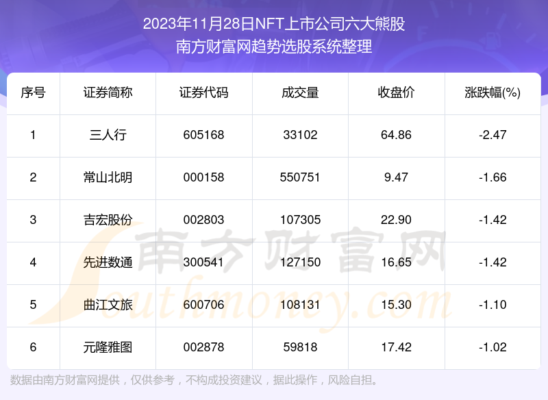 截止2023年11月28日,个股表现方面,NFT上市公司当日领跌股为三人行(605168),该股当日报收64.86,上涨-2.47%,成交量3.31万。常山北明(000158)以下跌-1.66%紧随其后,该股当日成交量55.08万。此外,吉宏股份(002803)、先进数通(300541)、曲江文旅(600706)均进入当日NFT上市公司熊股之列。