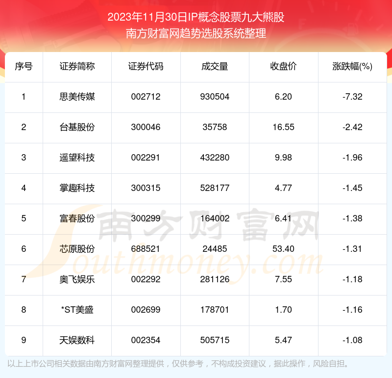 截止2023年11月30日,个股表现方面,IP概念概念股票当日领跌股为思美传媒(002712),该股当日报收6.20,上涨-7.32%,成交量93.05万。台基股份(300046)以下跌-2.42%紧随其后,该股当日成交量3.58万。此外,遥望科技(002291)、掌趣科技(300315)、富春股份(300299)均进入当日IP概念概念股票熊股之列。