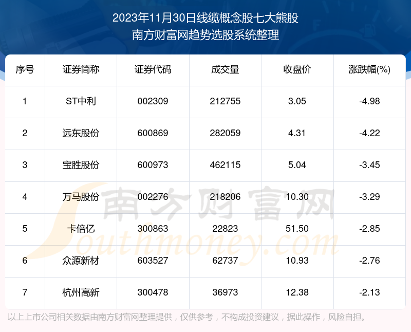 截止2023年11月30日,个股表现方面,线缆概念股当日领跌股为ST中利(002309),该股当日报收3.05,上涨-4.98%,成交量21.28万。远东股份(600869)以下跌-4.22%紧随其后,该股当日成交量28.21万。此外,宝胜股份(600973)、万马股份(002276)、卡倍亿(300863)均进入当日线缆概念股熊股之列。