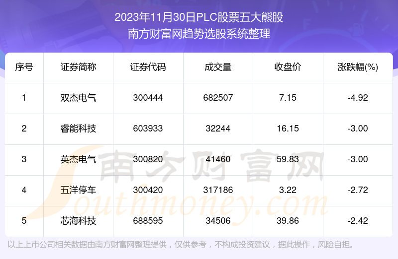 截止2023年11月30日,个股表现方面,PLC股票当日领跌股为双杰电气(300444),该股当日报收7.15,上涨-4.92%,成交量68.25万。睿能科技(603933)以下跌-3.00%紧随其后,该股当日成交量3.22万。此外,英杰电气(300820)、五洋停车(300420)、芯海科技(688595)均进入当日PLC股票熊股之列。