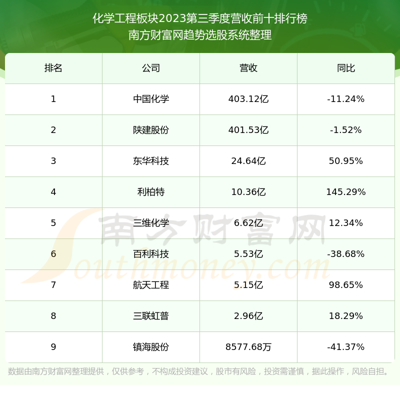 按照南方财富网趋势选股系统统计,该股所属板块为化学工程板块,该板块共有9只股票,中国化学2023第三季度营收在该板块中排名为第1名,该板块2023第三季度营收排名前十的股票如下表: