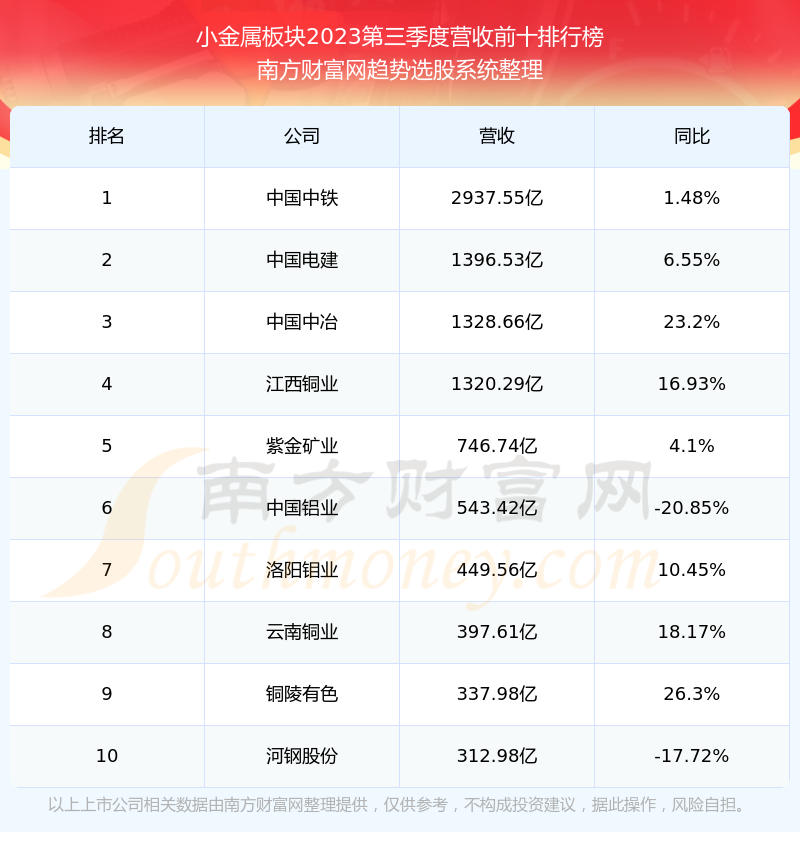 按照南方财富网趋势选股系统统计,该股所属板块为小金属板块,该板块共有158只股票,贵研铂业2023第三季度营收在该板块中排名为第21名,该板块2023第三季度营收排名前十的股票如下表: