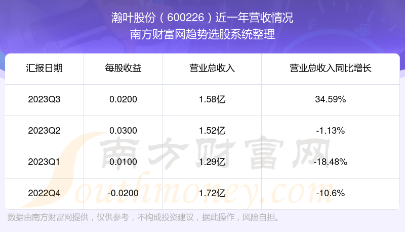 财报显示,2023年第三季度瀚叶股份营收1.58亿元,同比增长34.59%,净利润5244.61万元,同比增长-64.73%。