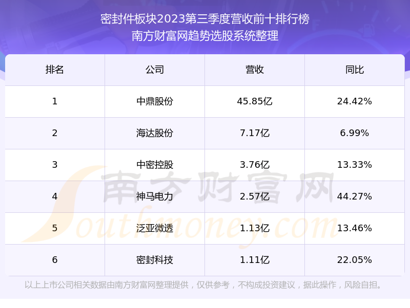 按照南方财富网趋势选股系统统计,该股所属板块为密封件板块,该板块共有6只股票,万朗磁塑2023第三季度营收在该板块中排名为第6名,该板块2023第三季度营收排名前十的股票如下表: