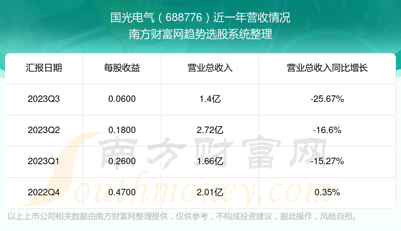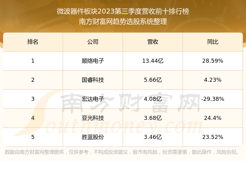 按照南方财富网趋势选股系统统计,该股所属板块为微波器件板块,该板块共有5只股票,国光电气2023第三季度营收在该板块中排名为第5名,该板块2023第三季度营收排名前十的股票如下表: