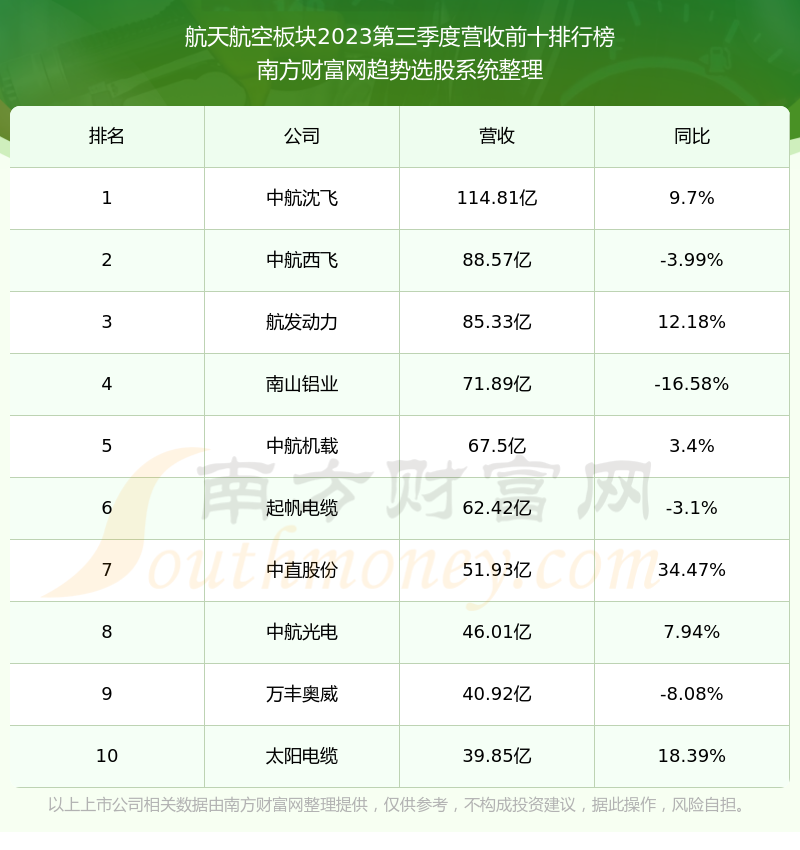 按照南方财富网趋势选股系统统计,该股所属板块为航天航空板块,该板块共有119只股票,中航机载2023第三季度营收在该板块中排名为第5名,该板块2023第三季度营收排名前十的股票如下表: