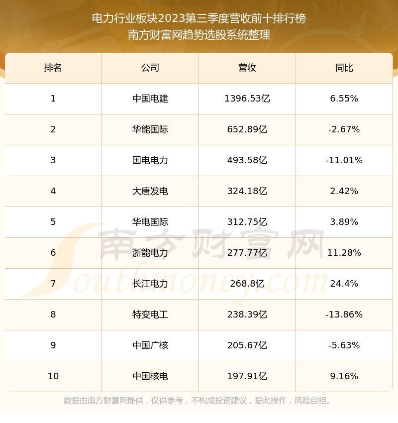 按照南方财富网趋势选股系统统计,该股所属板块为电力行业板块,该板块共有93只股票,三峡水利2023第三季度营收在该板块中排名为第40名,该板块2023第三季度营收排名前十的股票如下表: