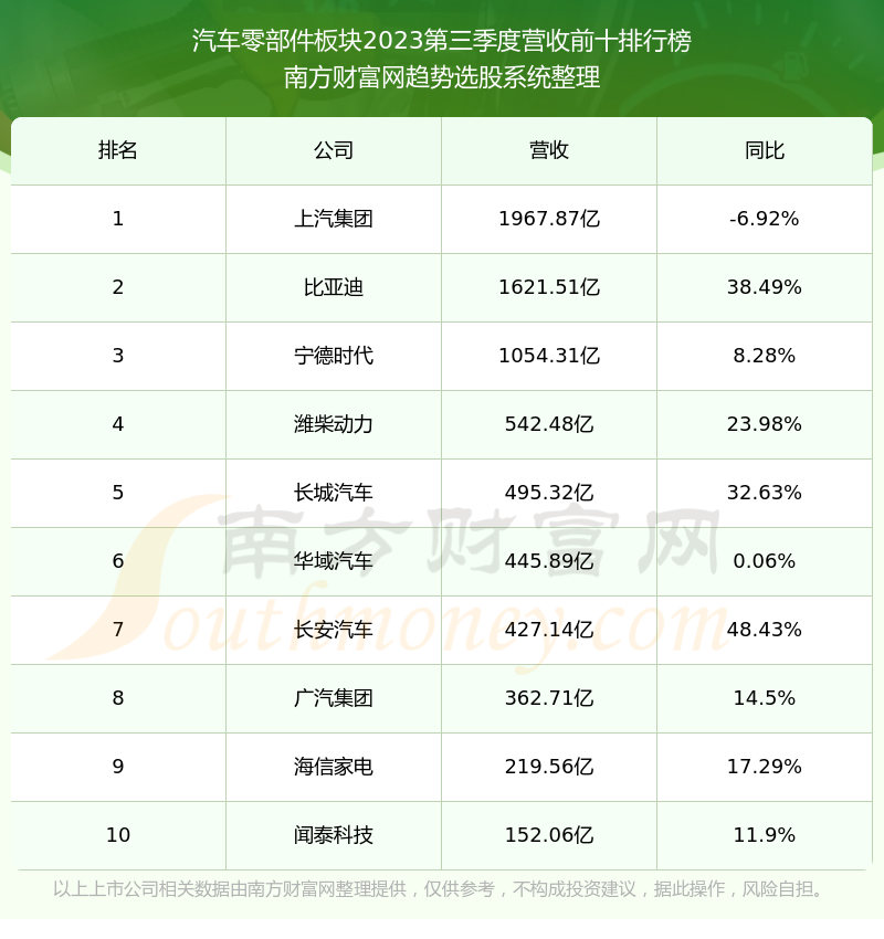 按照南方财富网趋势选股系统统计,该股所属板块为汽车零部件板块,该板块共有468只股票,汉马科技2023第三季度营收在该板块中排名为第175名,该板块2023第三季度营收排名前十的股票如下表: