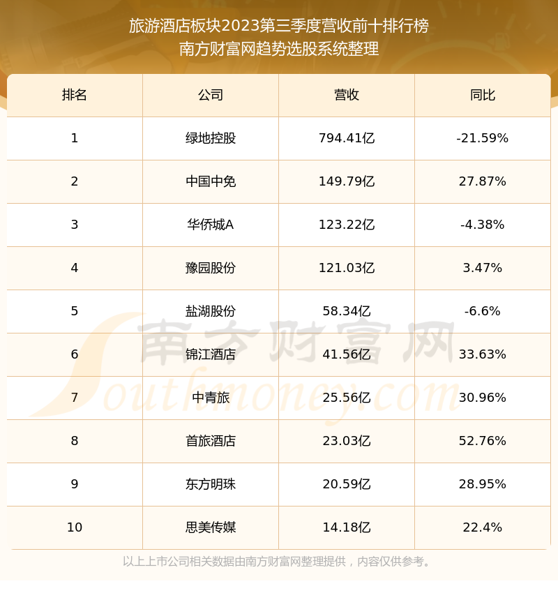 按照南方财富网趋势选股系统统计,该股所属板块为旅游酒店板块,该板块共有62只股票,长白山2023第三季度营收在该板块中排名为第33名,该板块2023第三季度营收排名前十的股票如下表: