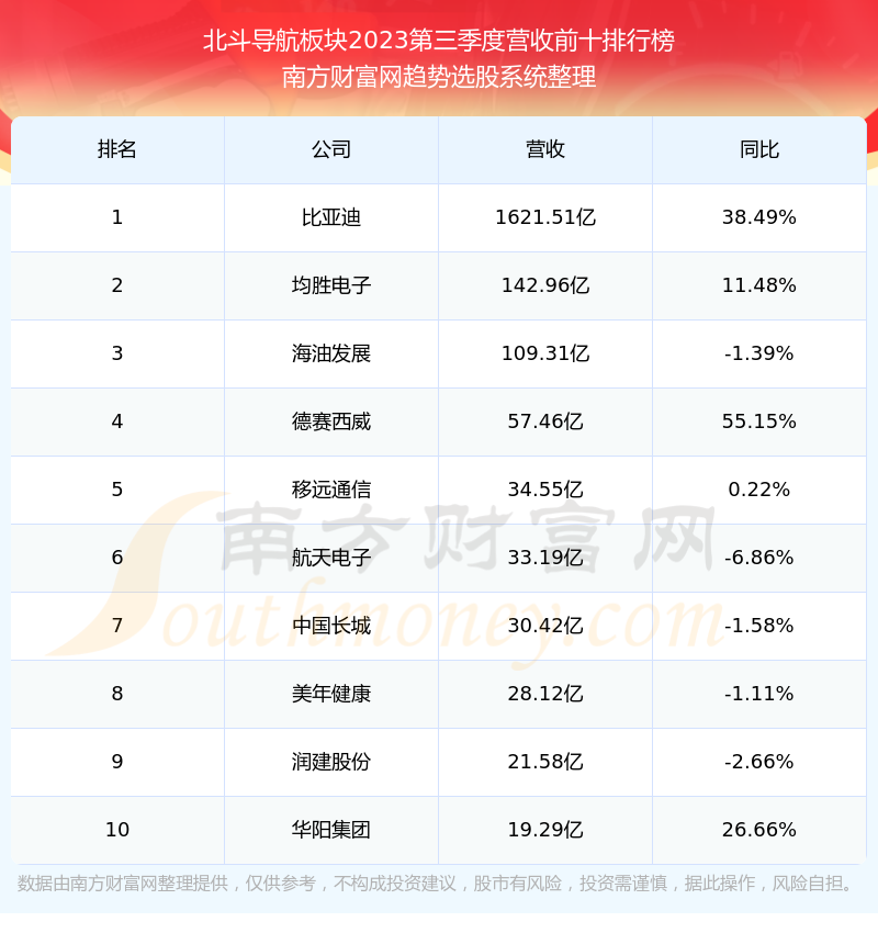 按照南方财富网趋势选股系统统计,该股所属板块为北斗导航板块,该板块共有112只股票,长江通信2023第三季度营收在该板块中排名为第111名,该板块2023第三季度营收排名前十的股票如下表: