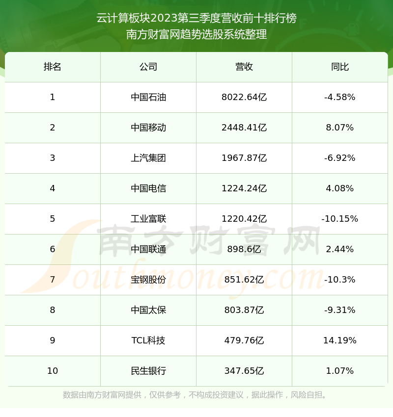 按照南方财富网趋势选股系统统计,该股所属板块为云计算板块,该板块共有331只股票,用友网络2023第三季度营收在该板块中排名为第57名,该板块2023第三季度营收排名前十的股票如下表: