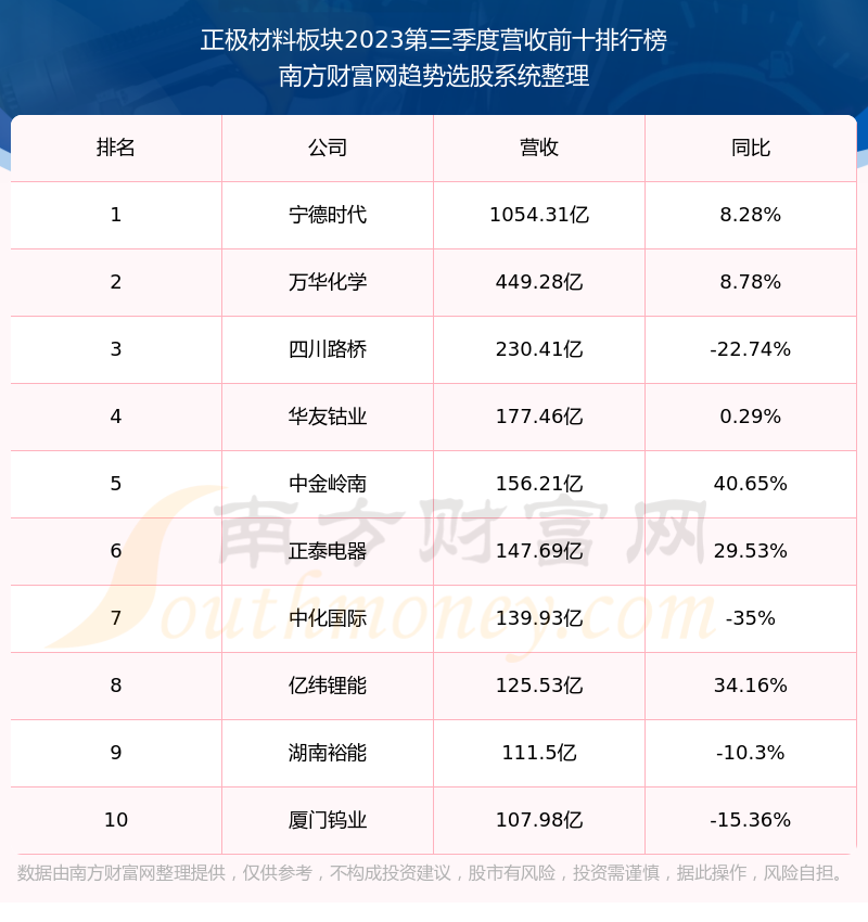 按照南方财富网趋势选股系统统计,该股所属板块为正极材料板块,该板块共有94只股票,华友钴业2023第三季度营收在该板块中排名为第4名,该板块2023第三季度营收排名前十的股票如下表: