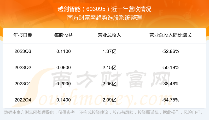 越剑智能2023年第三季度显示,公司主营收入1.37亿元,同比-52.86%;归母净利润1914.77万元,同比-93.83%;扣非净利润1374.19万元,同比-69.12%;