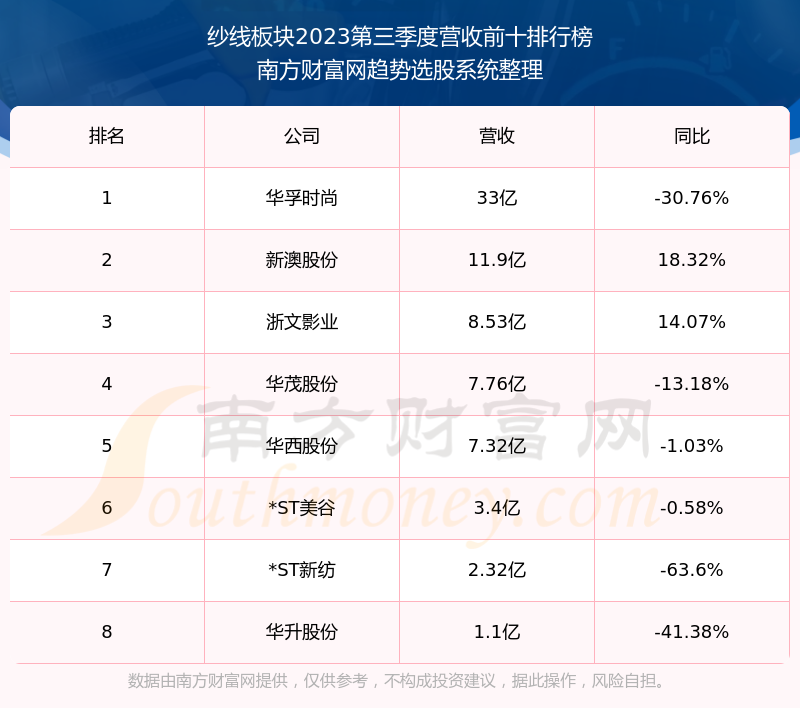 按照南方财富网趋势选股系统统计,该股所属板块为纱线板块,该板块共有8只股票,浙文影业2023第三季度营收在该板块中排名为第3名,该板块2023第三季度营收排名前十的股票如下表: