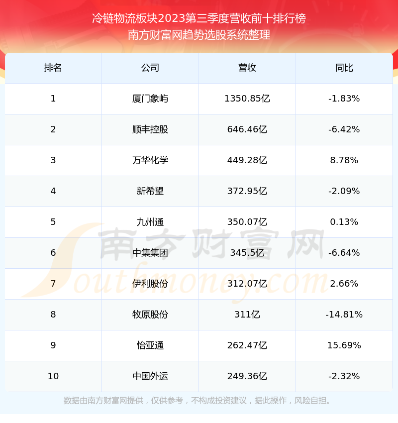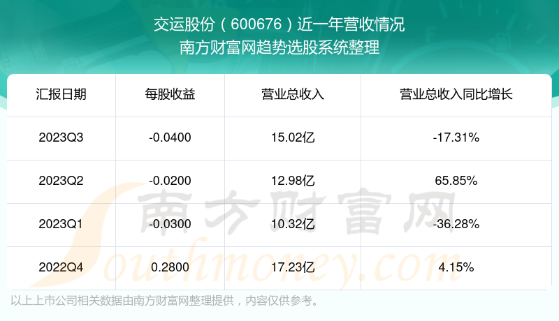 按照南方财富网趋势选股系统统计,该股所属板块为冷链物流板块,该板块共有143只股票,交运股份2023第三季度营收在该板块中排名为第67名,该板块2023第三季度营收排名前十的股票如下表: