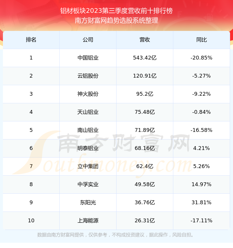 按照南方财富网趋势选股系统统计,该股所属板块为铝材板块,该板块共有29只股票,丽岛新材2023第三季度营收在该板块中排名为第25名,该板块2023第三季度营收排名前十的股票如下表: