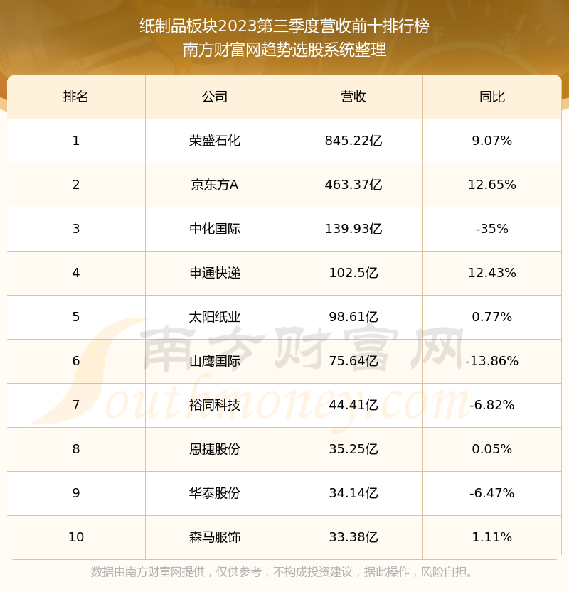 按照南方财富网趋势选股系统统计,该股所属板块为纸制品板块,该板块共有67只股票,仙鹤股份2023第三季度营收在该板块中排名为第14名,该板块2023第三季度营收排名前十的股票如下表:
