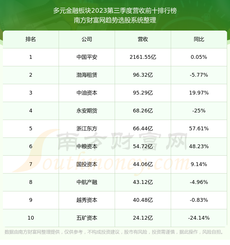 按照南方财富网趋势选股系统统计,该股所属板块为多元金融板块,该板块共有35只股票,爱建集团2023第三季度营收在该板块中排名为第19名,该板块2023第三季度营收排名前十的股票如下表: