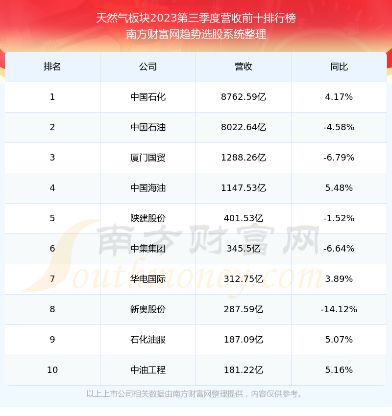 按照南方财富网趋势选股系统统计,该股所属板块为天然气板块,该板块共有158只股票,深圳燃气2023第三季度营收在该板块中排名为第20名,该板块2023第三季度营收排名前十的股票如下表: