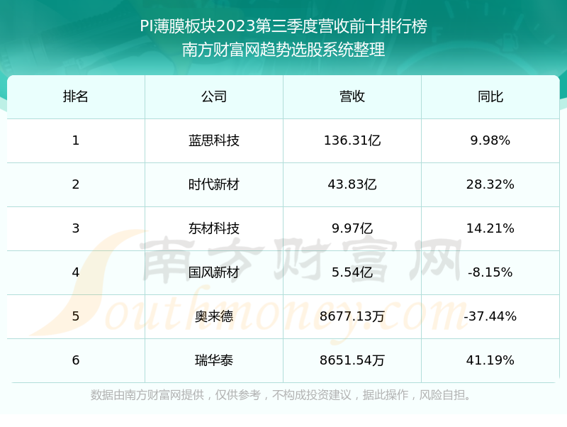 按照南方财富网趋势选股系统统计,该股所属板块为PI薄膜板块,该板块共有6只股票,瑞华泰2023第三季度营收在该板块中排名为第6名,该板块2023第三季度营收排名前十的股票如下表: