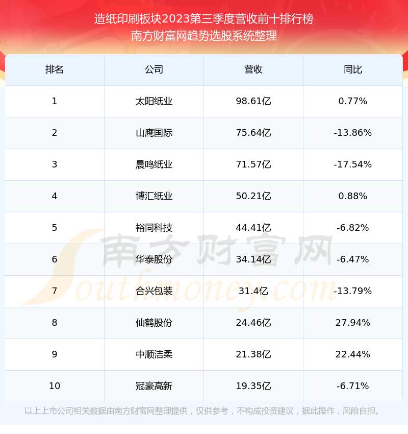 按照南方财富网趋势选股系统统计,该股所属板块为造纸印刷板块,该板块共有48只股票,民丰特纸2023第三季度营收在该板块中排名为第29名,该板块2023第三季度营收排名前十的股票如下表:
