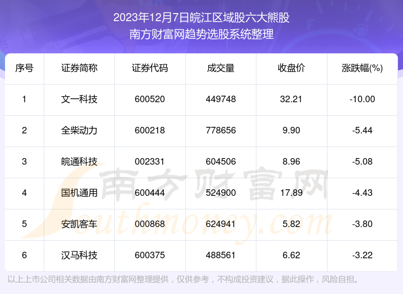 截止2023年12月7日,个股表现方面,皖江区域股当日领跌股为文一科技(600520),该股当日报收32.21,上涨-10.00%,成交量44.97万。全柴动力(600218)以下跌-5.44%紧随其后,该股当日成交量77.87万。此外,皖通科技(002331)、国机通用(600444)、安凯客车(000868)均进入当日皖江区域股熊股之列。