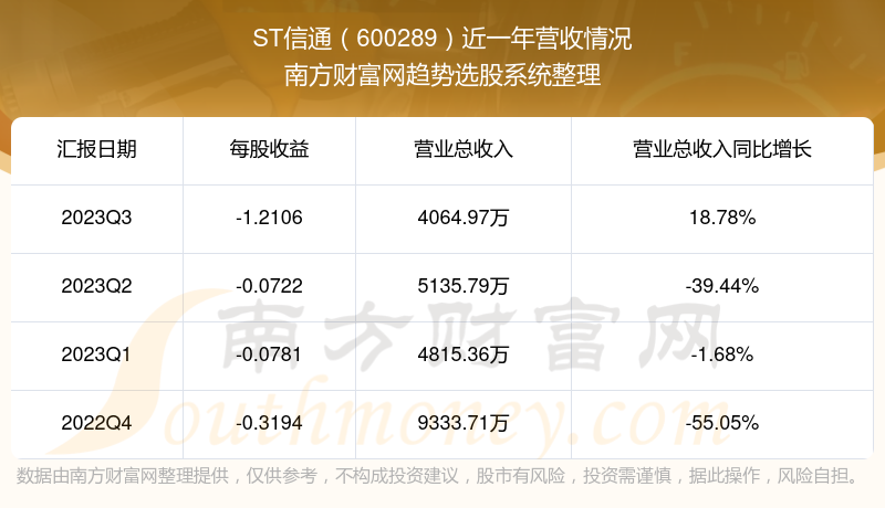 2023年第三季度,ST信通营收同比18.78%,净利润同比-1380.84%。