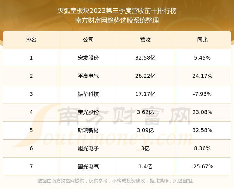 按照南方财富网趋势选股系统统计,该股所属板块为灭弧室板块,该板块共有7只股票,宝光股份2023第三季度营收在该板块中排名为第4名,该板块2023第三季度营收排名前十的股票如下表: