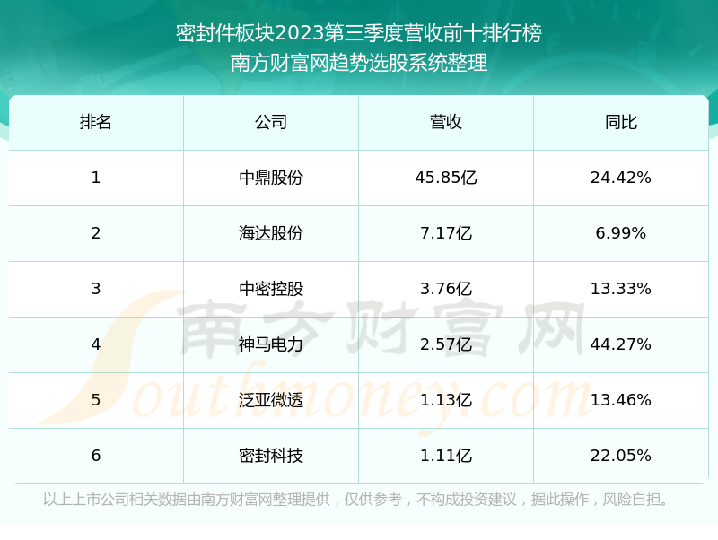 按照南方财富网趋势选股系统统计,该股所属板块为密封件板块,该板块共有6只股票,万朗磁塑2023第三季度营收在该板块中排名为第6名,该板块2023第三季度营收排名前十的股票如下表: