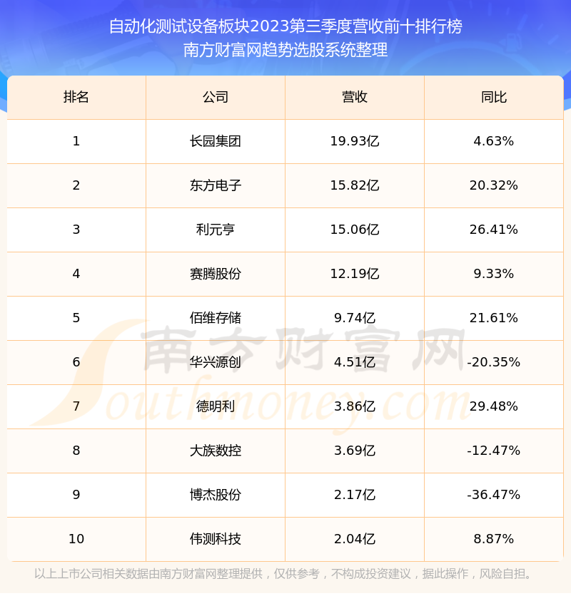 按照南方财富网趋势选股系统统计,该股所属板块为自动化测试设备板块,该板块共有15只股票,燕麦科技2023第三季度营收在该板块中排名为第14名,该板块2023第三季度营收排名前十的股票如下表: