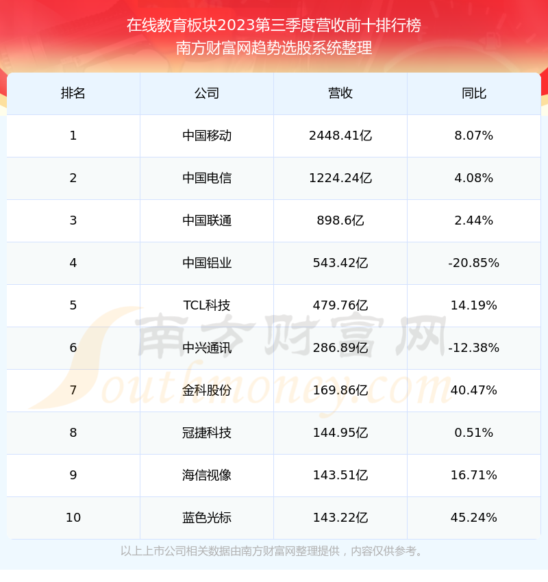 按照南方财富网趋势选股系统统计,该股所属板块为在线教育板块,该板块共有162只股票,山东出版2023第三季度营收在该板块中排名为第22名,该板块2023第三季度营收排名前十的股票如下表: