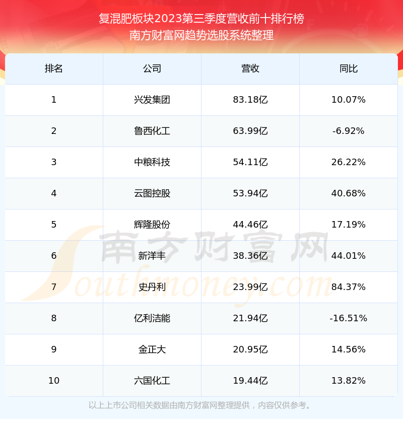 按照南方财富网趋势选股系统统计,该股所属板块为复混肥板块,该板块共有18只股票,亿利洁能2023第三季度营收在该板块中排名为第8名,该板块2023第三季度营收排名前十的股票如下表: