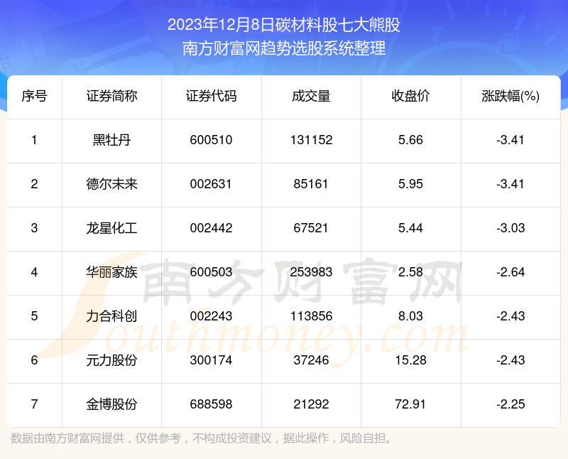 截止2023年12月8日,个股表现方面,碳材料股当日领跌股为黑牡丹(600510),该股当日报收5.66,上涨-3.41%,成交量13.12万。德尔未来(002631)以下跌-3.41%紧随其后,该股当日成交量8.52万。此外,龙星化工(002442)、华丽家族(600503)、力合科创(002243)均进入当日碳材料股熊股之列。