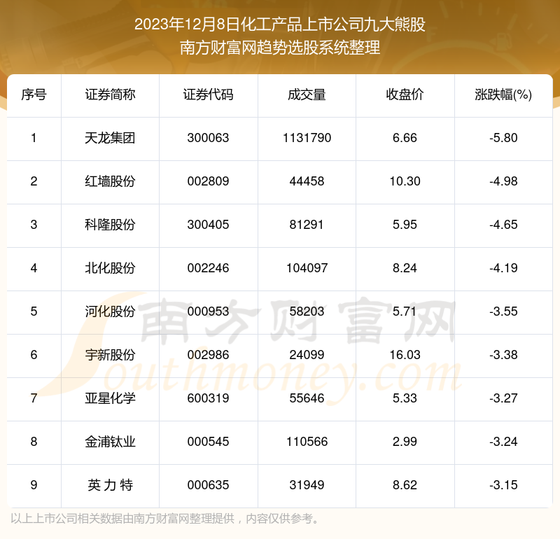 以上内容就是对【至尊配资 【数据复盘】化工产品上市公司2023年12月8日九大熊股】的解答,如果解决了您的问题欢迎把链接分享给朋友(https://www.youge168.com/mod_article-article_content-article_id-51634.html)