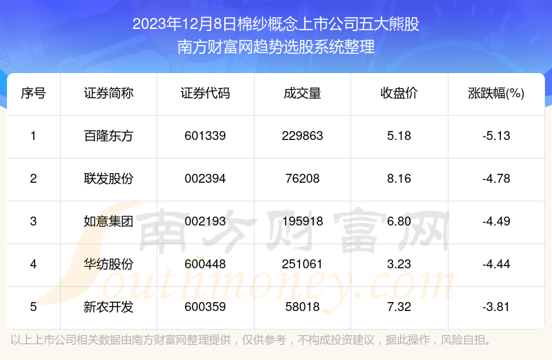截止2023年12月8日,个股表现方面,棉纱概念上市公司当日领跌股为百隆东方(601339),该股当日报收5.18,上涨-5.13%,成交量22.99万。联发股份(002394)以下跌-4.78%紧随其后,该股当日成交量7.62万。此外,如意集团(002193)、华纺股份(600448)、新农开发(600359)均进入当日棉纱概念上市公司熊股之列。