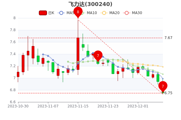 12月8日收盘短讯,飞力达股价15点收盘跌2.74%,报价6.750元,市值达到24.98亿。