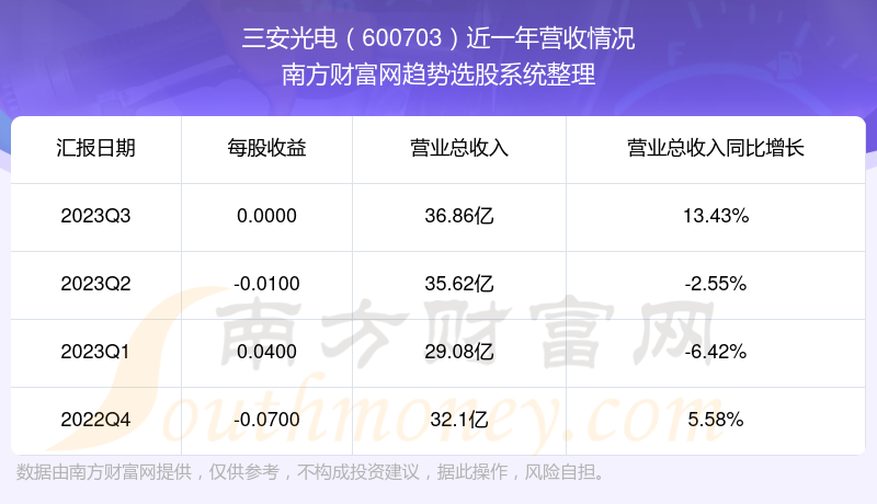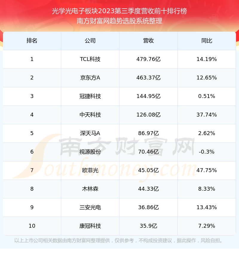 按照南方财富网趋势选股系统统计,该股所属板块为光学光电子板块,该板块共有122只股票,三安光电2023第三季度营收在该板块中排名为第9名,该板块2023第三季度营收排名前十的股票如下表: