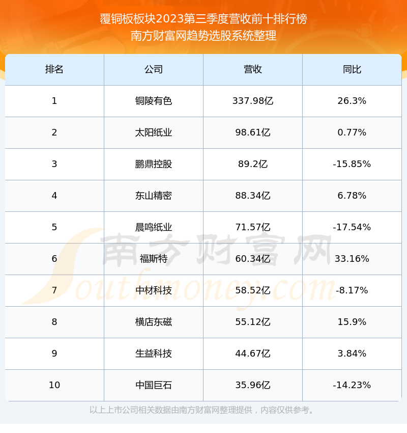 按照南方财富网趋势选股系统统计,该股所属板块为覆铜板板块,该板块共有57只股票,生益科技2023第三季度营收在该板块中排名为第9名,该板块2023第三季度营收排名前十的股票如下表: