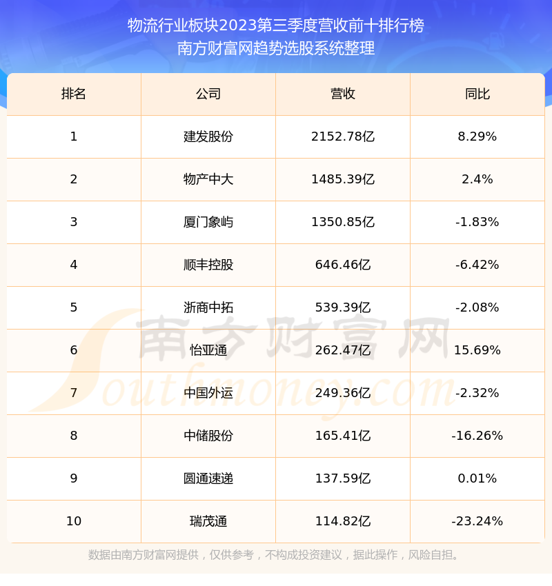 按照南方财富网趋势选股系统统计,该股所属板块为物流行业板块,该板块共有57只股票,密尔克卫2023第三季度营收在该板块中排名为第19名,该板块2023第三季度营收排名前十的股票如下表:
