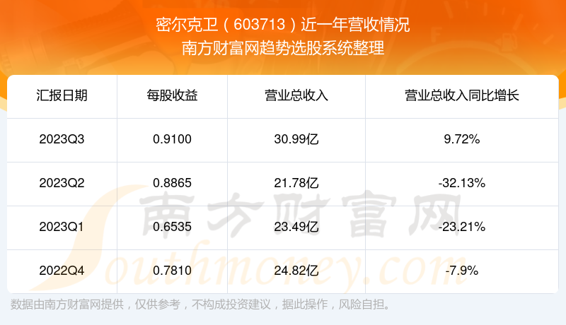 密尔克卫发布2023年第三季度财报。实现总营收30.99亿元,同比增长9.72%;扣非净利润同比增长-15.68%至1.4亿元。