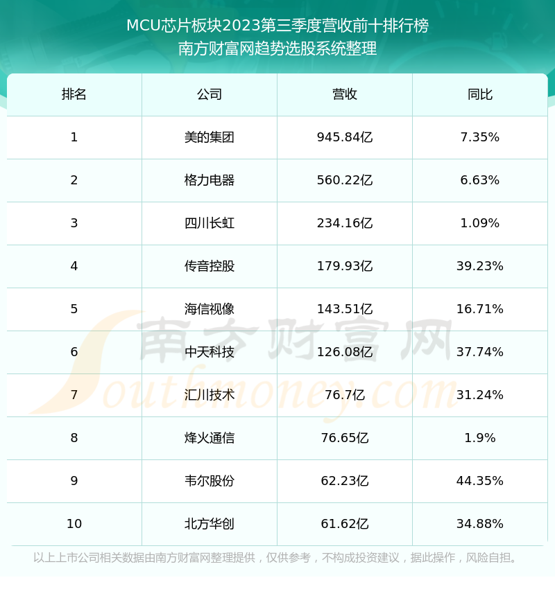 按照南方财富网趋势选股系统统计,该股所属板块为MCU芯片板块,该板块共有79只股票,钜泉科技2023第三季度营收在该板块中排名为第79名,该板块2023第三季度营收排名前十的股票如下表: