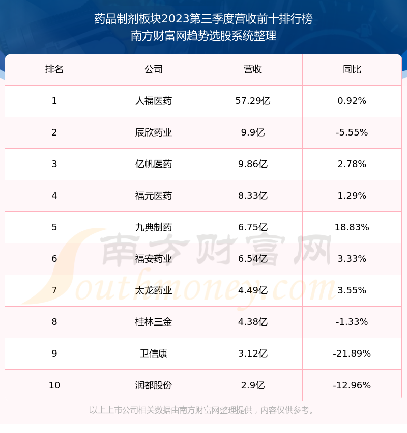 按照南方财富网趋势选股系统统计,该股所属板块为药品制剂板块,该板块共有15只股票,迪哲医药2023第三季度营收在该板块中排名为第15名,该板块2023第三季度营收排名前十的股票如下表: