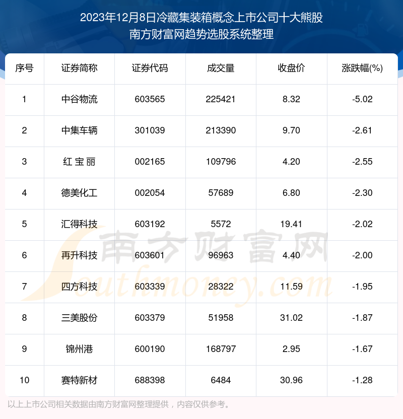截止2023年12月8日,个股表现方面,冷藏集装箱概念上市公司当日领跌股为中谷物流(603565),该股当日报收8.32,上涨-5.02%,成交量22.54万。中集车辆(301039)以下跌-2.61%紧随其后,该股当日成交量21.34万。此外,红 宝 丽(002165)、德美化工(002054)、汇得科技(603192)均进入当日冷藏集装箱概念上市公司熊股之列。