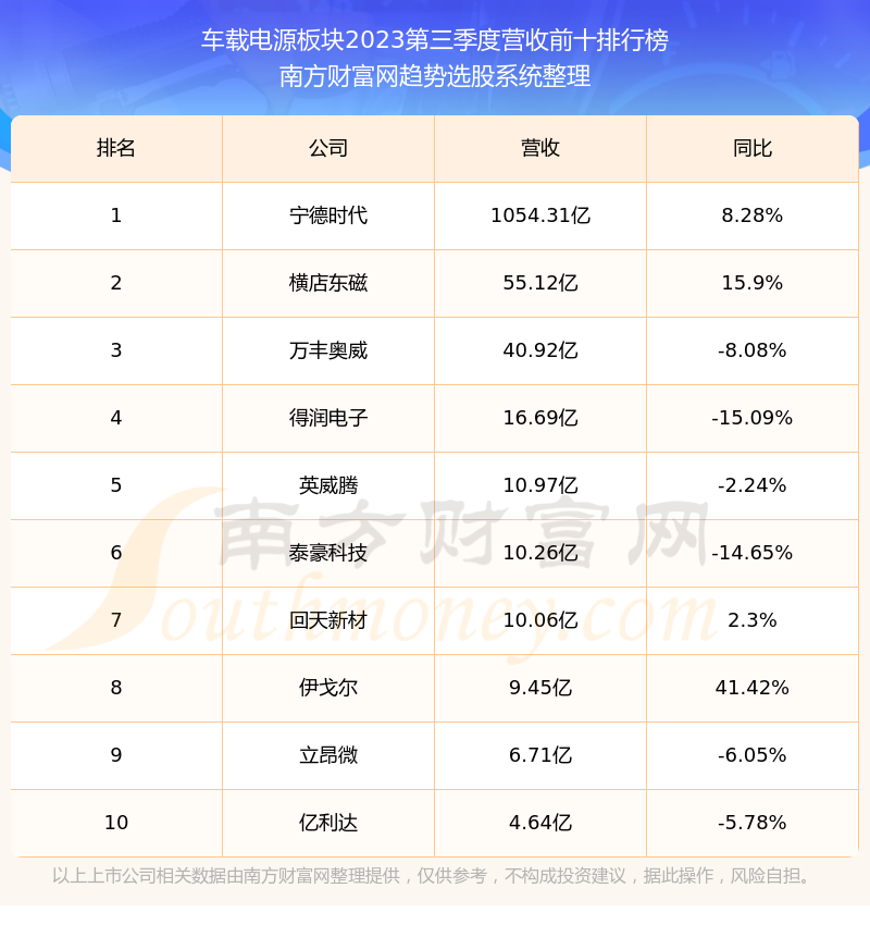 按照南方财富网趋势选股系统统计,该股所属板块为车载电源板块,该板块共有14只股票,威迈斯2023第三季度营收在该板块中排名为第14名,该板块2023第三季度营收排名前十的股票如下表: