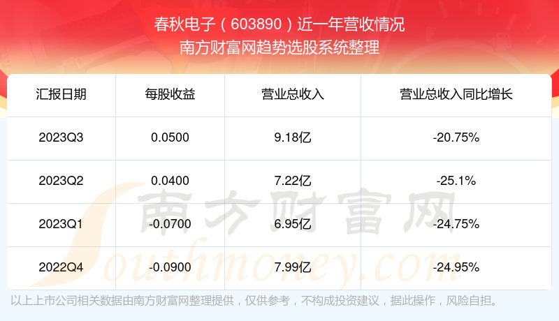 春秋电子发布2023年第三季度财报。实现总营收9.18亿元,同比增长-20.75%;扣非净利润同比增长-72.15%至2565.24万元。
