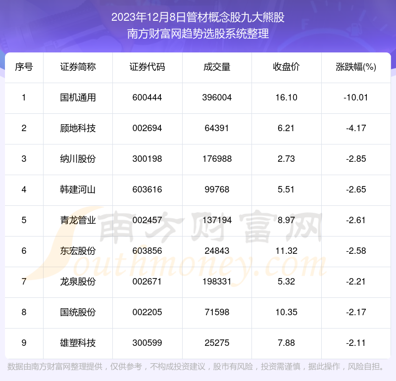 截止2023年12月8日,个股表现方面,管材概念股当日领跌股为国机通用(600444),该股当日报收16.10,上涨-10.01%,成交量39.6万。顾地科技(002694)以下跌-4.17%紧随其后,该股当日成交量6.44万。此外,纳川股份(300198)、韩建河山(603616)、青龙管业(002457)均进入当日管材概念股熊股之列。