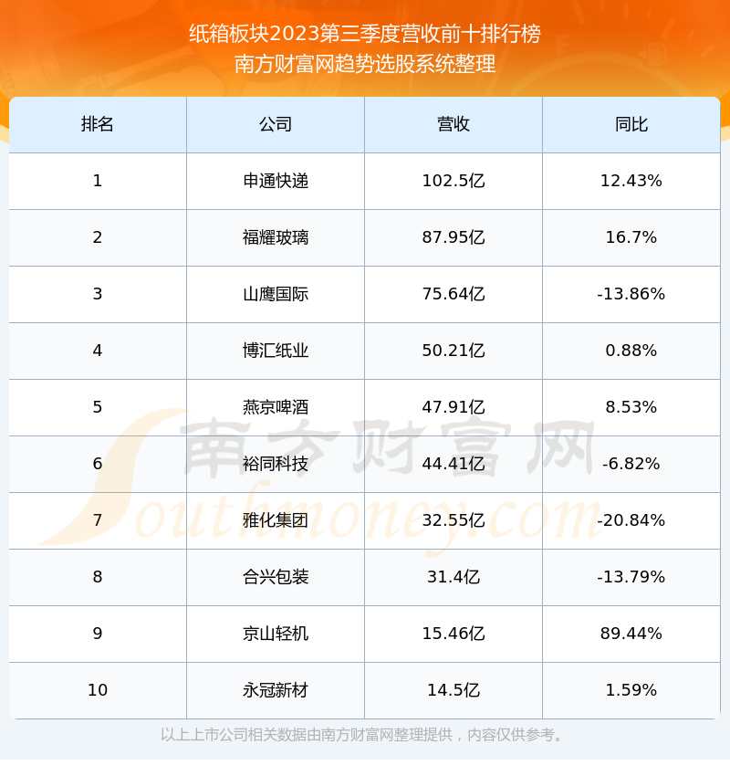 按照南方财富网趋势选股系统统计,该股所属板块为纸箱板块,该板块共有34只股票,大胜达2023第三季度营收在该板块中排名为第24名,该板块2023第三季度营收排名前十的股票如下表: