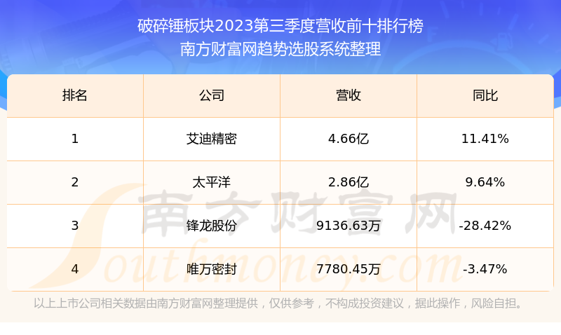 按照南方财富网趋势选股系统统计,该股所属板块为破碎锤板块,该板块共有4只股票,艾迪精密2023第三季度营收在该板块中排名为第1名,该板块2023第三季度营收排名前十的股票如下表: