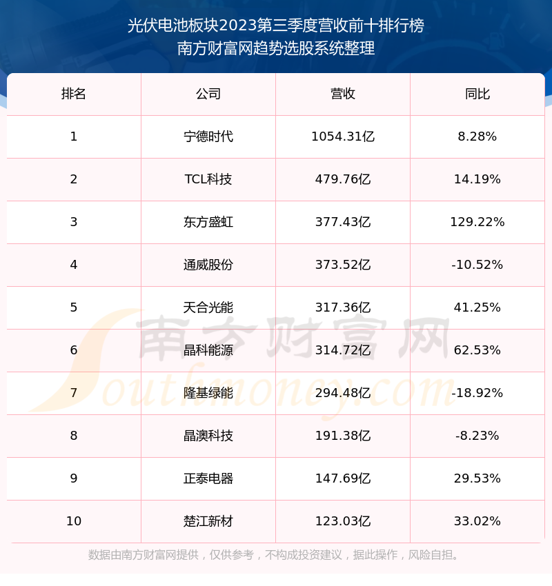 按照南方财富网趋势选股系统统计,该股所属板块为光伏电池板块,该板块共有75只股票,时创能源2023第三季度营收在该板块中排名为第75名,该板块2023第三季度营收排名前十的股票如下表: